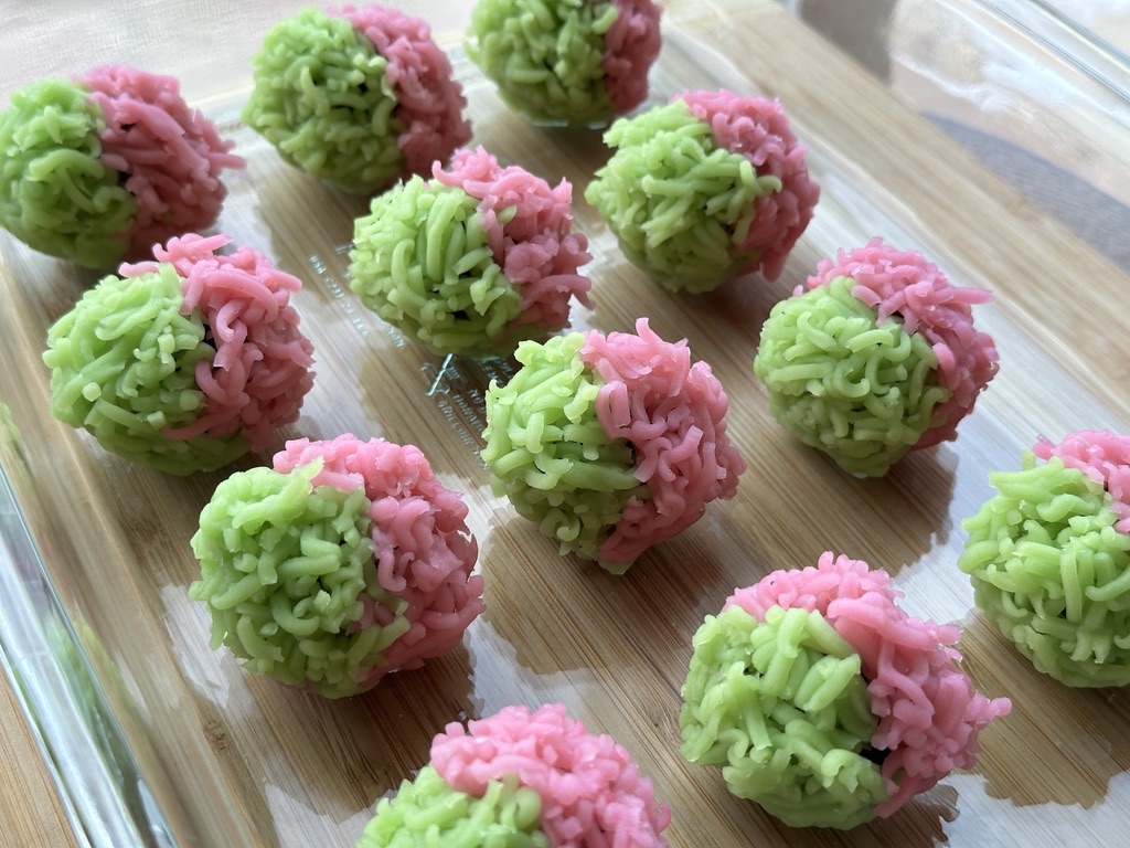 Cooked for 18m on max heat steam (should have done 20m or 22m). Then added some mitsu etc, and after kneading, ended up with a total of almost exactly 400g. Left 100g for later and used the other 300g for sweets.